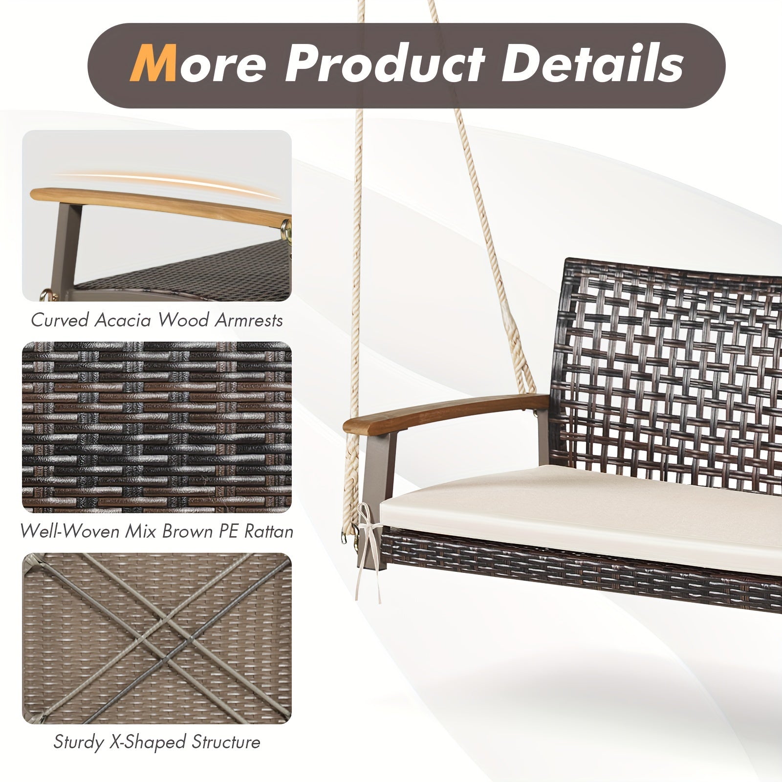 2-Person Patio Rattan Hanging Swing Chair Porch Loveseat Cushion White