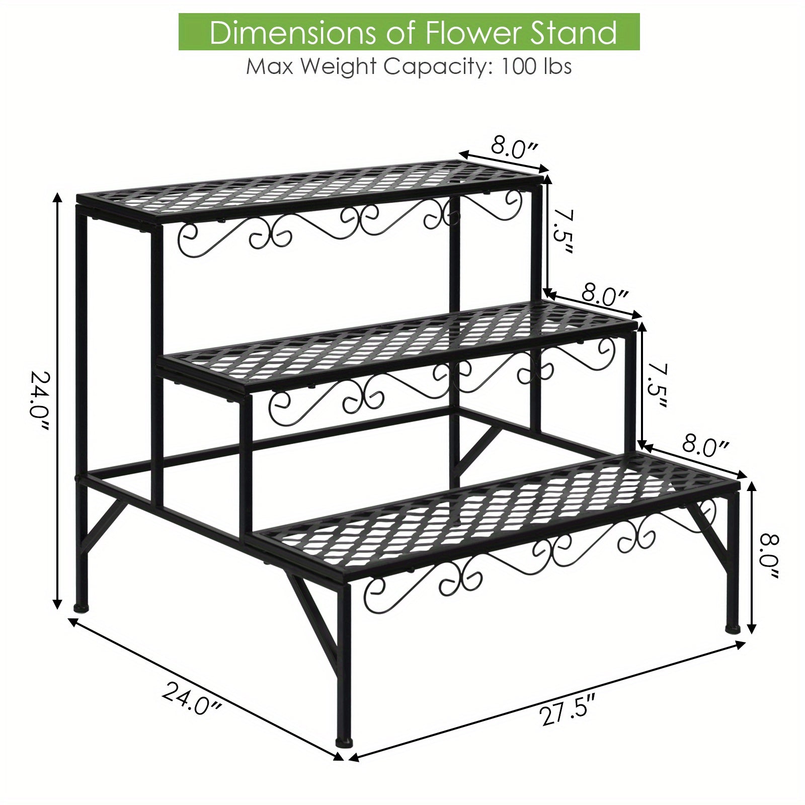 The plant stand is made of steel in black color, weighing 12 lbs, with a load capacity of 100 lbs. Its overall dimensions are 27.5” (L) X 24” (W) X 24” (H). The package includes a 3-tier metal plant stand and a user guide.