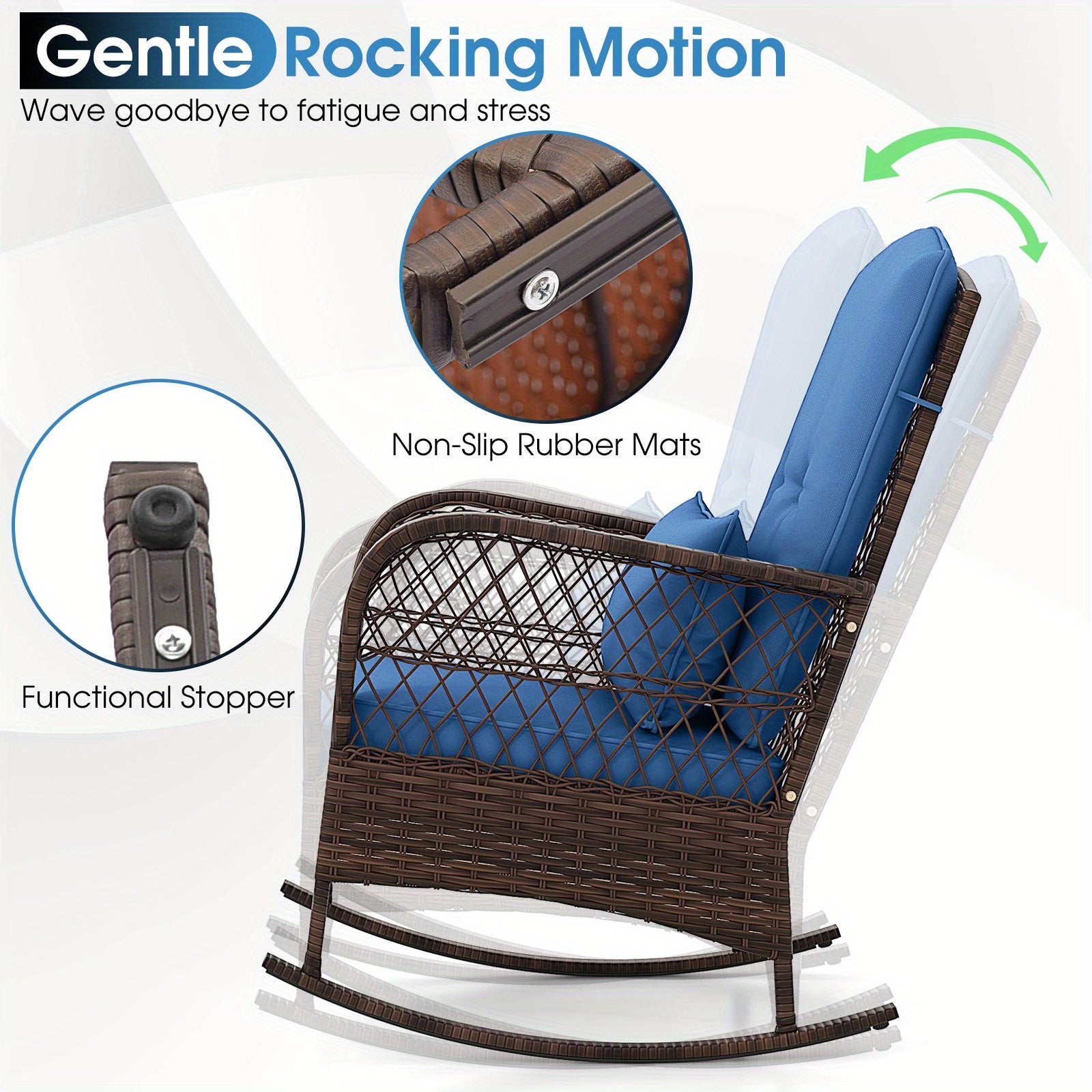 3pcs Patio Rocker Set, Outdoor Wicker Rocking Chairs w/ Double-Layer Coffee Table, Rattan Rocker Chair Set w/ Seat Back Cushions & Pillows, for Porch, Backyard, Poolside.