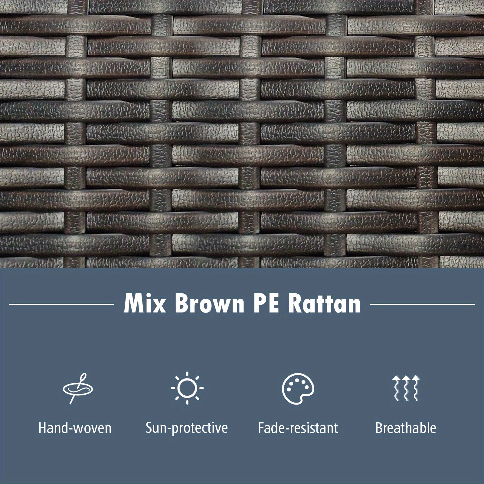 Color: Rattan color is a blend of brown. Cushion color includes a mix of brown, grey, navy, and red. Material consists of PE rattan, metal, tempered glass, polyester, and sponge. The rocking chair measures 34 inches in length, 26.5 inches in width, and 37 inches in height. The coffee table has dimensions of 18.5 inches by 18.5 inches by 20 inches. The seat cushion is 21 inches long, 20 inches wide, and 3 inches thick. The back cushion measures 26 inches by 23 inches by 2 inches. The lumbar pillow is 17.5 inches long, 11.5 inches wide, and 5.5 inches thick. The seat height is 15 inches, and the seat depth is 20 inches.