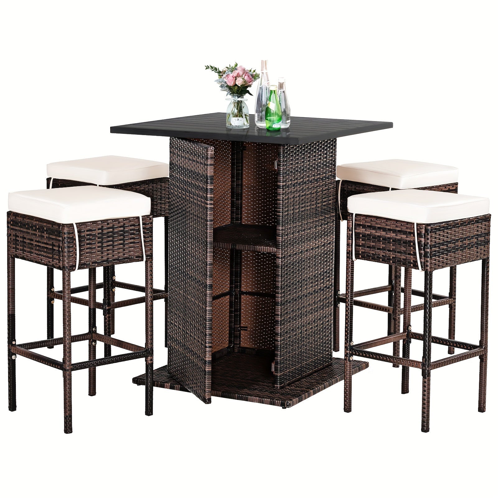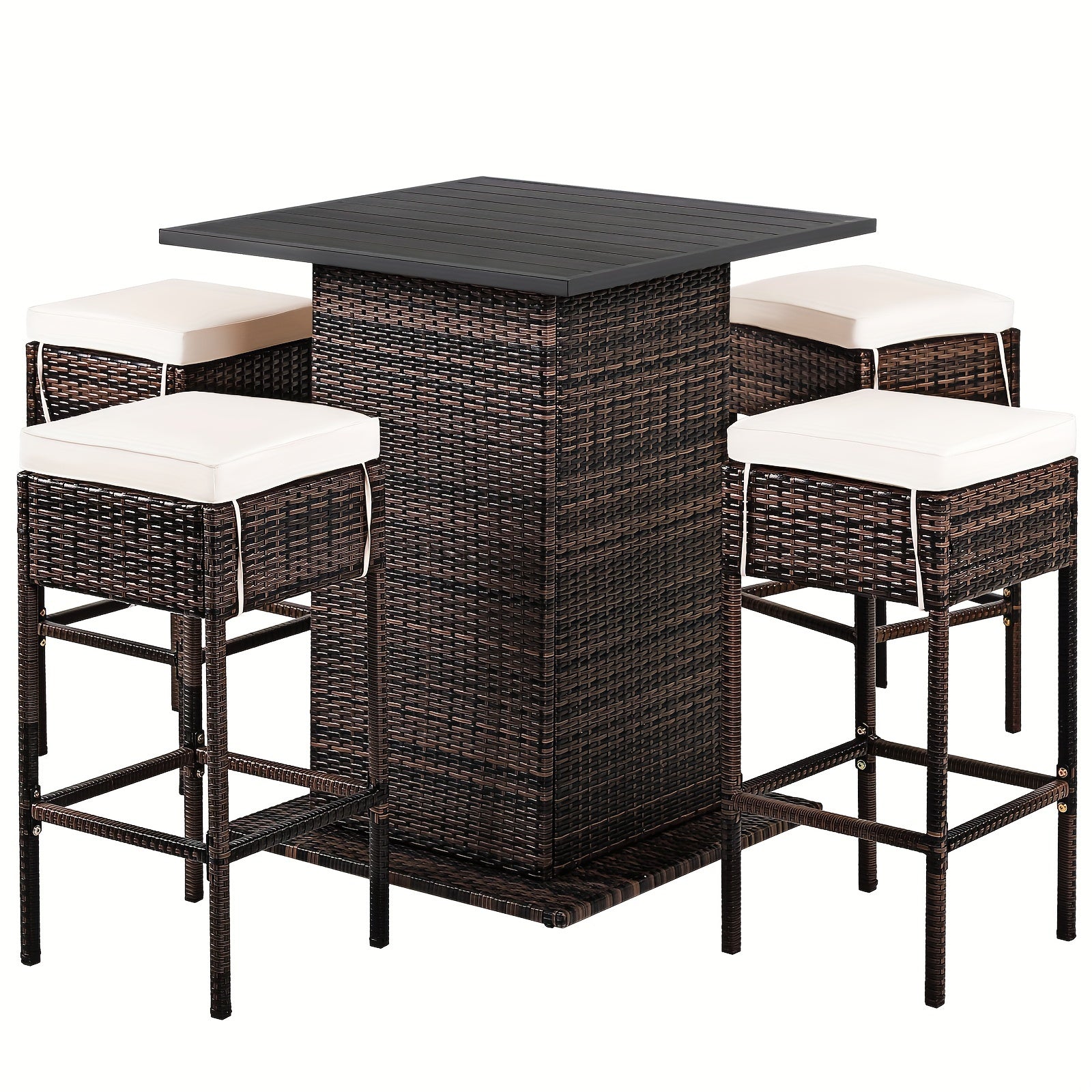 5pcs Rattan Patio Bar Set with Hidden Storage - Includes Table, 4 Stools & Waterproof Cushions - Weather-Resistant PE Wicker for Outdoor Gatherings, Shelf