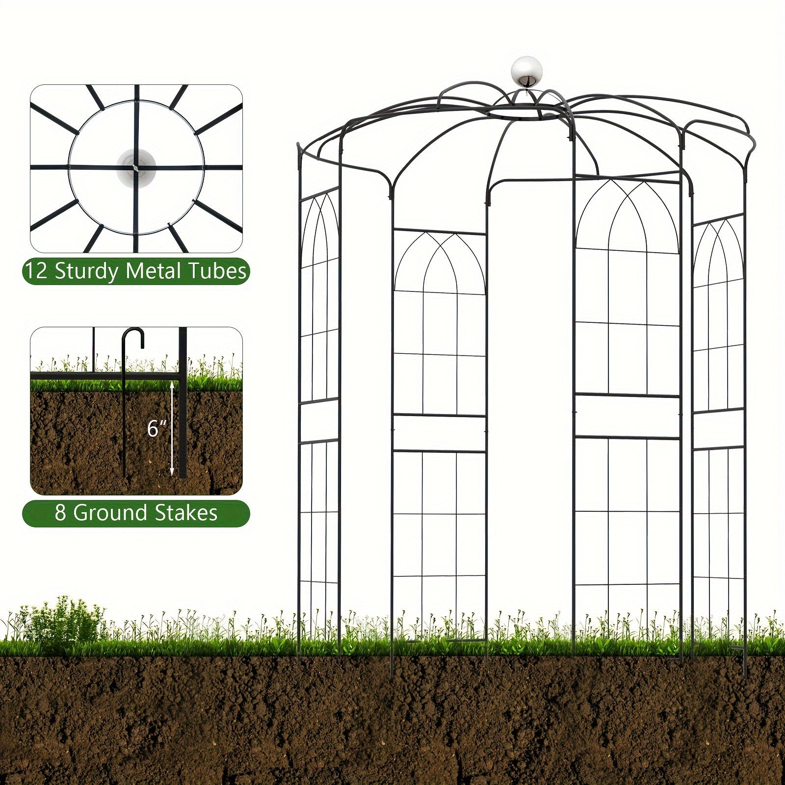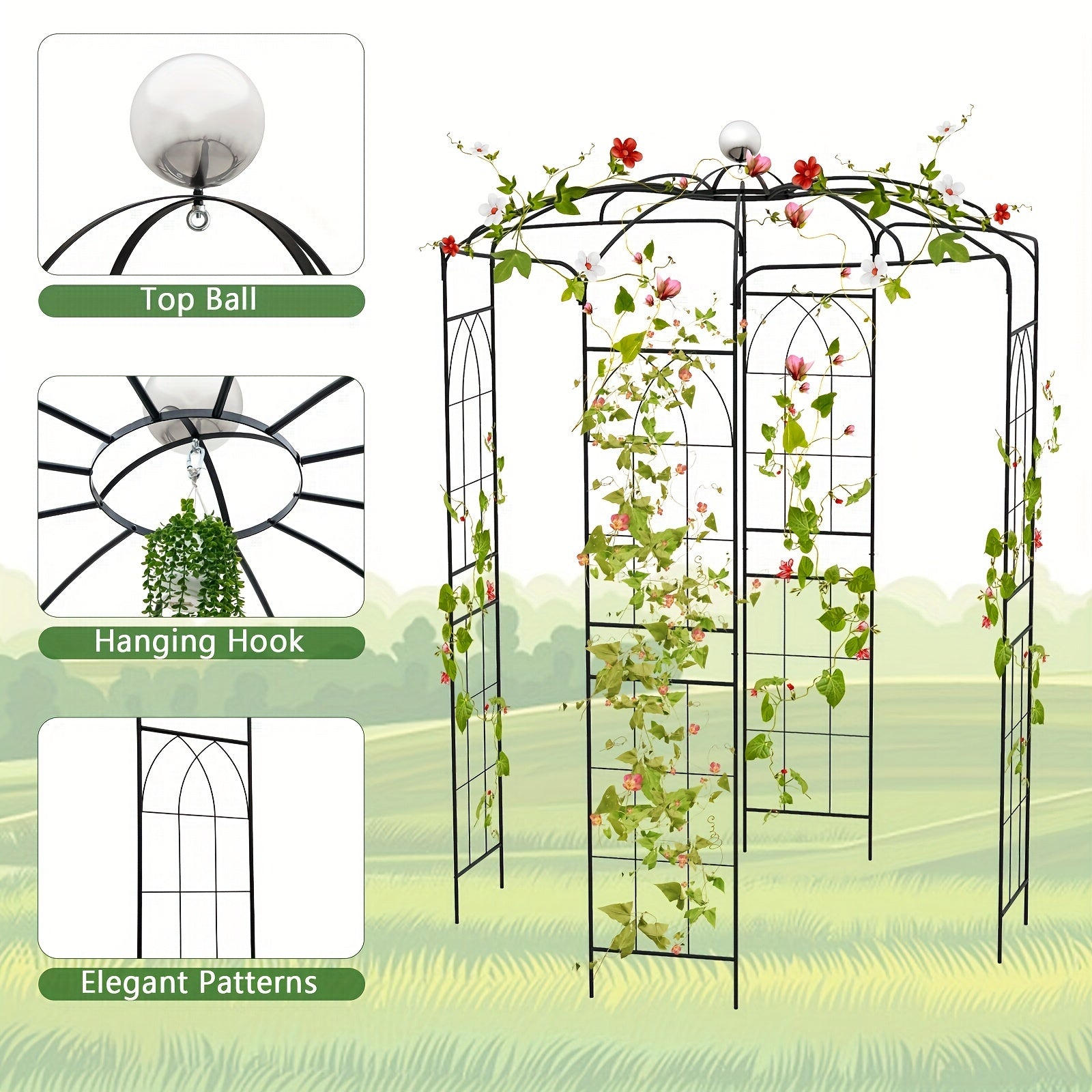 The gazebo in the shape of a birdcage comes in black color and is made of metal. It has overall dimensions of 81" x 81" x 113" (L x W x H), with each entrance measuring 41" x 92" (L x H) and each trellis measuring 20" x 76" (L x H). The inserting depth is 6" and the hanging hook can hold up to 22 lbs. The gazebo weighs 29.5 lbs and includes 1 x Birdcage Shape Gazebo, 8 x Ground Stakes, and 1 x User Guide.