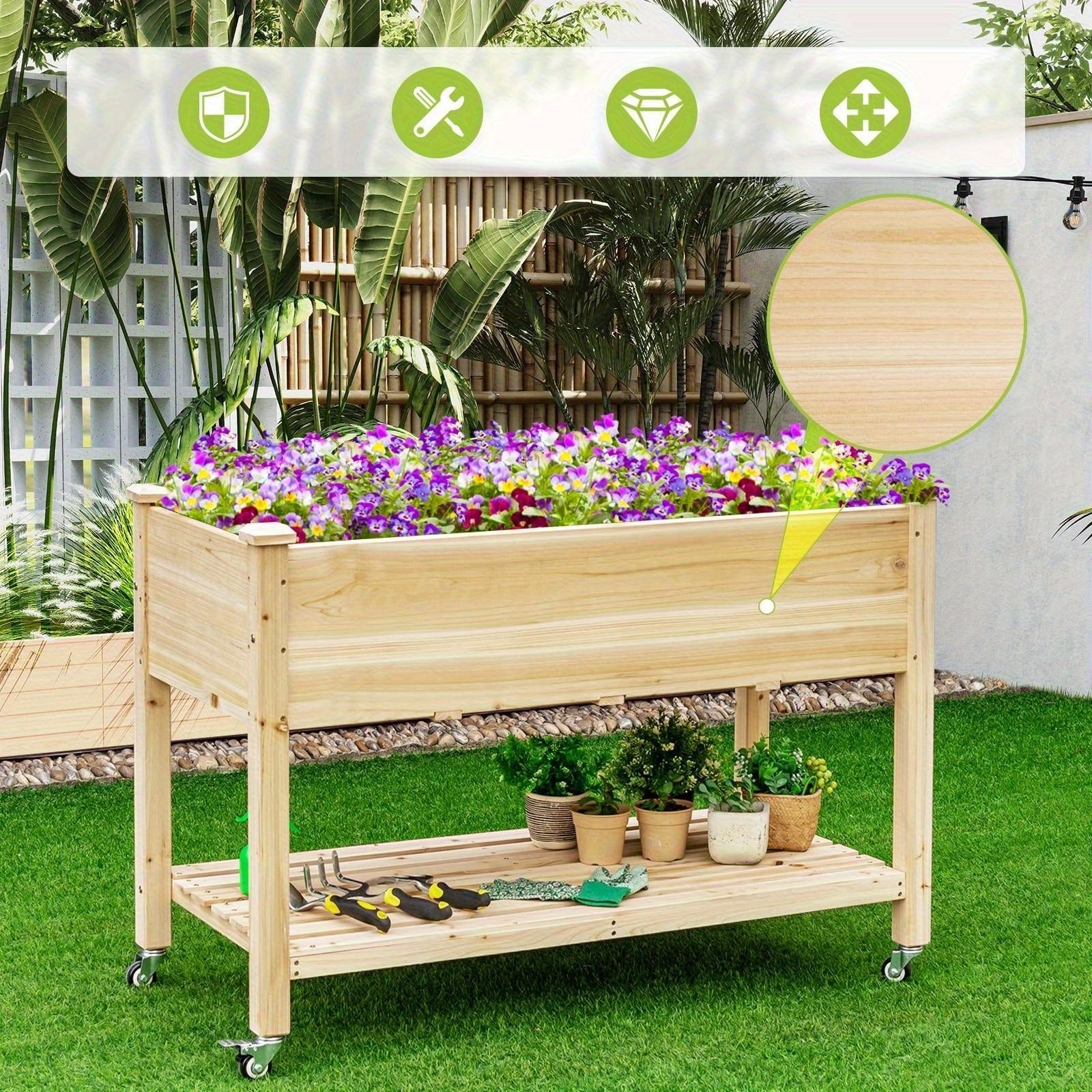Elevated Mobile Wooden Garden Bed on Lockable Wheels, Versatile Free-Standing Planter Box for Flowers, Ideal for Patio Spaces, Multi-Purpose Vegetable Bed with Integrated Storage Shelf, Natural