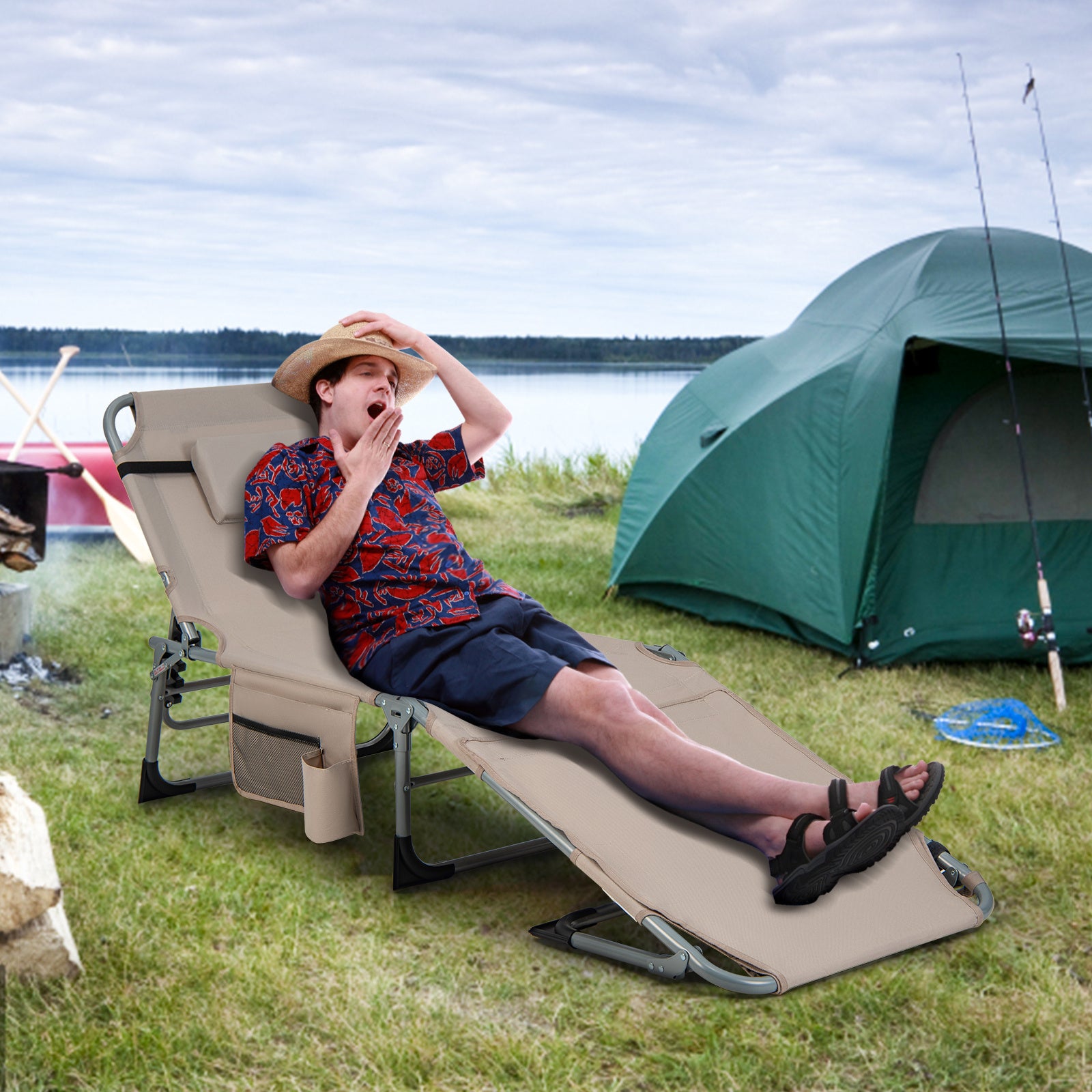 Heavy-Duty Outdoor Folding Chaise Lounge Chair - 5-Position Adjustable Backrest & Footrest, Portable Folding design with Face Hole & Armrests, Oxford Fabric & Aluminum Frame - for Pool, Beach, Patio, Camping - Supports 400 lbs
